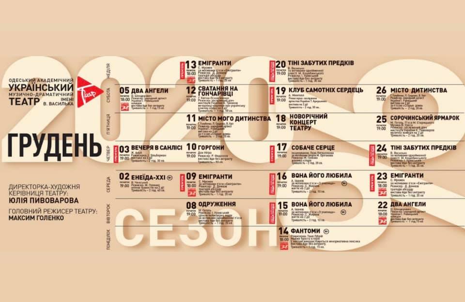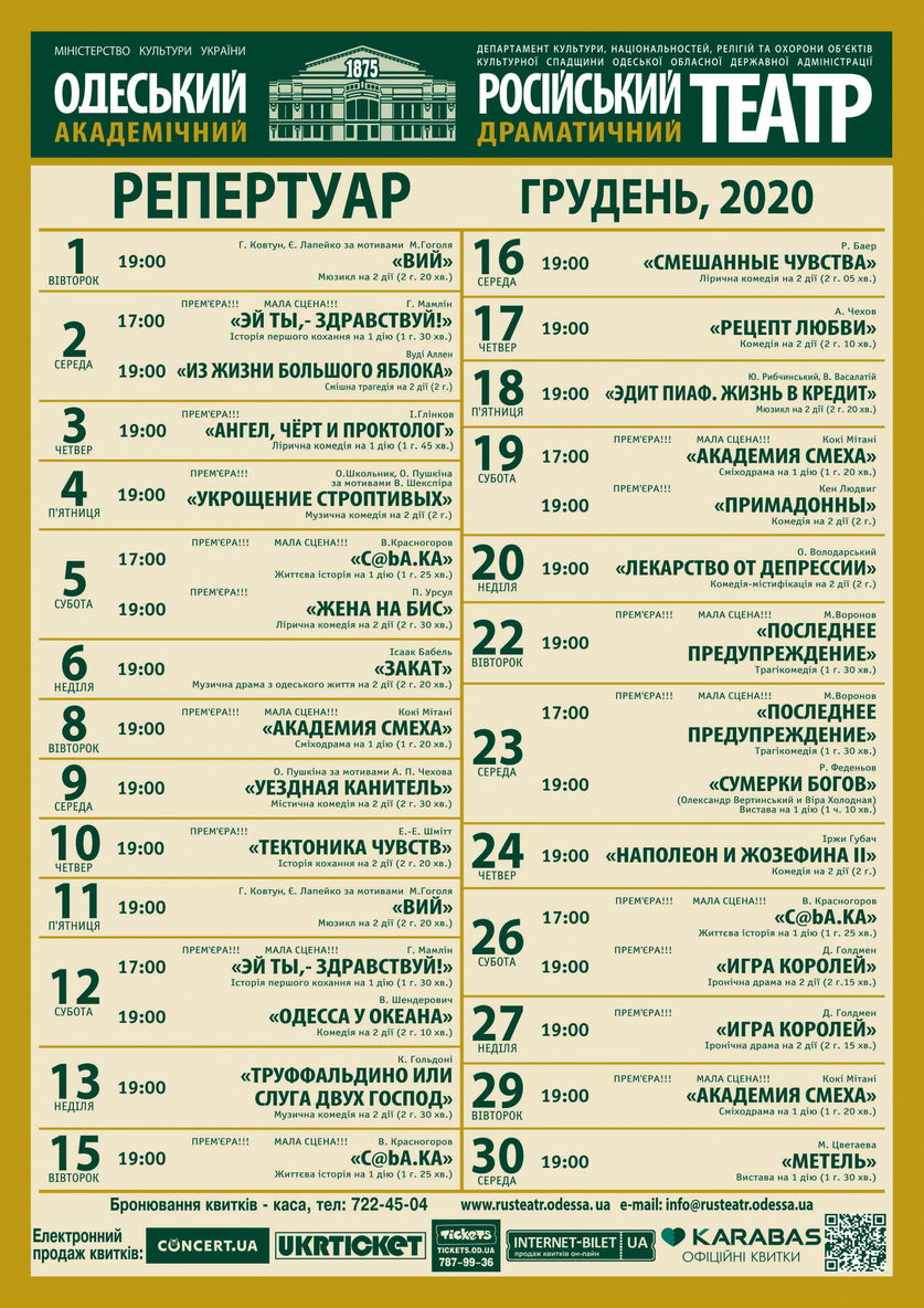 В условиях, пока еще, нежесткого карантина одесские театры продолжают свою работу, соблюдая все эпидемологические требования, и некоторые уже анонсировали афишу на декабрь.