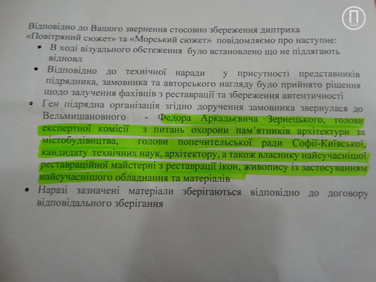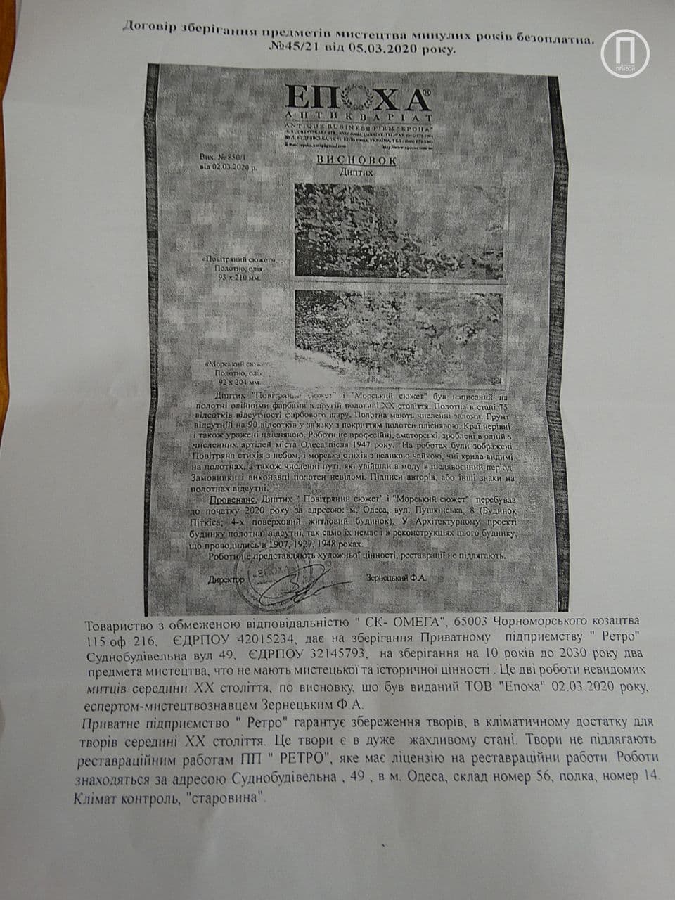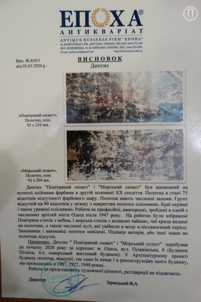 «В процессе работ были обнаружены две масляные картины, которые были закрыты гипсокартонными листами. По нашему запросу они были обследованы экспертами, которые дали свое заключение. Главой экспертной комиссии был Федор Зернецкий. Картины были демонтированы, по акту переданы ему на ответственное хранение. Согласно заключению, они не имеют ценности и даже неизвестен их автор», — рассказал Василий Никитенко.