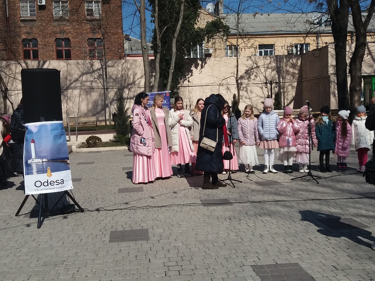 Забавно было за этим наблюдать: чиновница с натянутой улыбкой, сдавленным голосом, говорит что-то там про креативный город, музыку слова и прочие воздушные прелести… И тут же, пока дети читают стихи замечательных одесских поэтов, идёт дымить сигаретой прямо на глазах у доверчивых созданий в розовых платьицах – хора 8-й школы искусств (которые великолепно, хоть и под фонограмму «плюс», исполнили песню «Белый парус»).