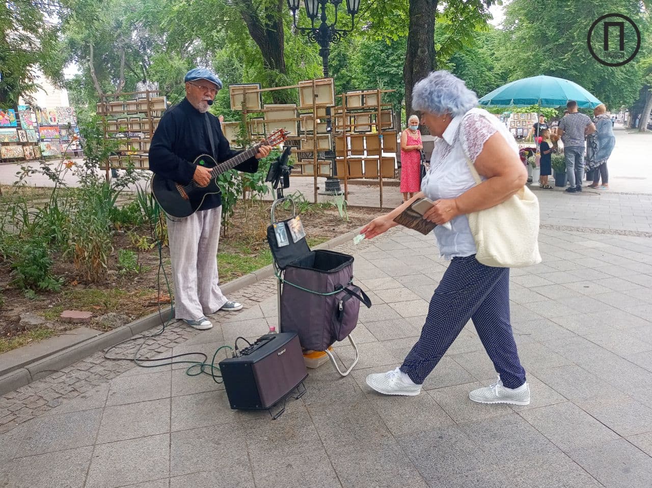 Сегодня Валерий на Соборную площадь вышел спонтанно, говорит, что даже еще не распелся толком, и погода вроде как, не сильно располагает. Однако, голос музыканта звучит пронзительно, и играет он не просто на гитаре, но и на струнах души случайных прохожих, которые то и дело останавливаются, чтобы послушать и поблагодарить артиста.