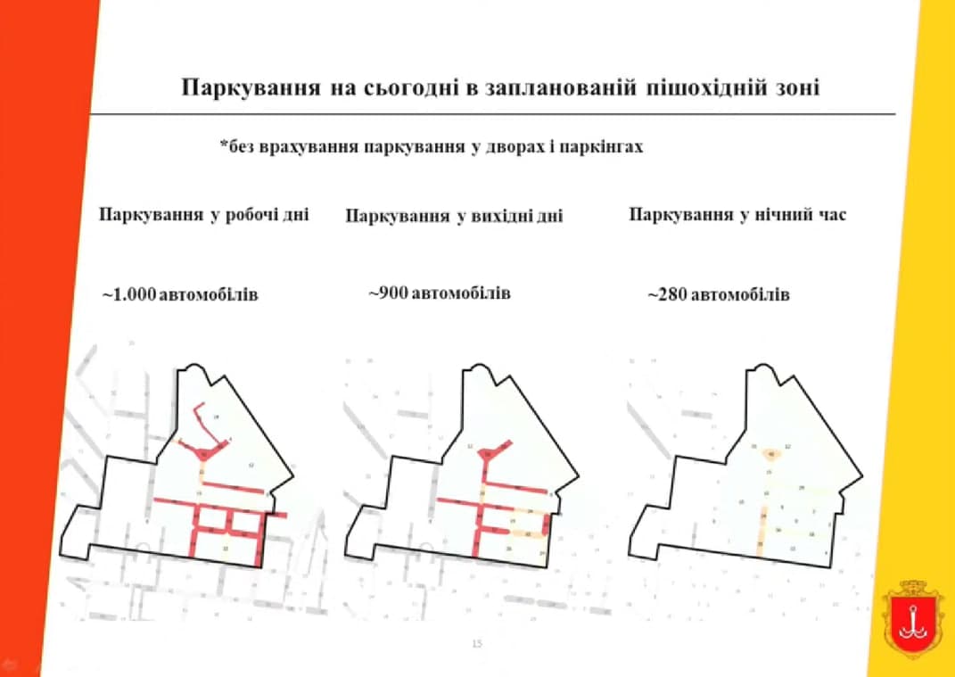 Сегодня в ходе своего доклада директор департамента транспорта и связи Одесского горсовета Сергей Тетюхин рассказал, что в выходные дни в центральной части города, которую планируют сделать пешеходной, припарковано порядка 900 автомобилей. В ходе анализа парковочных мест на прилегающей к будущей пешеходной зоне территории сотрудниками департамента было установлено, что их количества будет достаточно – это порядка 950 бесплатных паркомест (на расстоянии 450 м); и порядка 850 мест на платных парковках.
