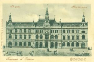 Слово «почтамт» — немецкое: составленное из корней Post — «почта» и Amt — «служба, управление». Первая почтовая контора была открыта в Одессе в 1816 году и почти семь лет разные ее службы находились в разных помещениях. Лишь в 1823 году город выделил Одесской пограничной почтовой конторе, как она тогда называлась, здание на углу улиц Жуковского и Екатерининской. А уж в специально построенных для него «хоромах» на Садовой, 10 почтамт обосновался лишь в 1898 году.