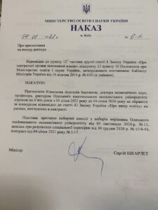 Приказ министра образования и науки С. Шкарлета о назначении Анатолия Ивановича на должность ректора был подписан 4 января 2021 года. Собственно, его и самого Верховная Рада Украины официально утвердила на посту министра – хоть и минимальным количеством голосов –всего лишь 18 декабря 2020 года. До того он не имел права подписывать такого уровня документы, судьбообразующие для одного из важнейших вузов страны.
