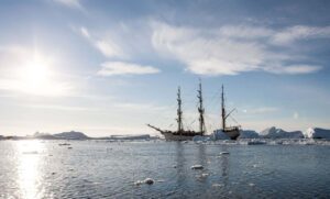 Наш корабль со скоростью 9 узлов (17 км в час) движется в сторону Антарктиды. Ожидаем, что мы будем там под католическое Рождество — 25 декабря«.