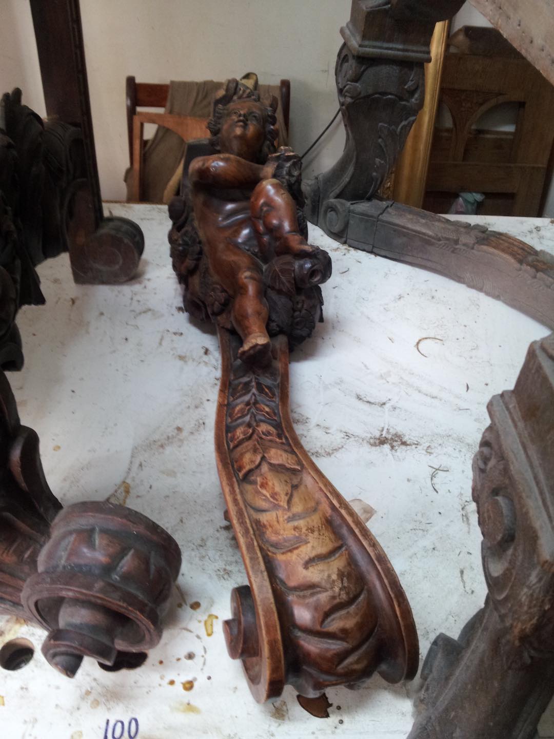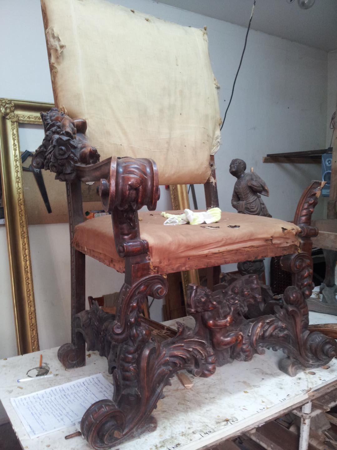 Андрей Вакаренко занимался «лечением» деревянных частей и восстановлением конструкционной прочности кресла: восстановил сломанный правый подлокотник; частично реконструировал потерянные и поврежденные детали деревянной резьбы; отреставрировал потери от механических повреждений; очистил деревянные части от возрастных пылевых загрязнений; очистил и выровнял лаковую пленку; нанес защитный слой шеллака и выполнил ряд других операций.