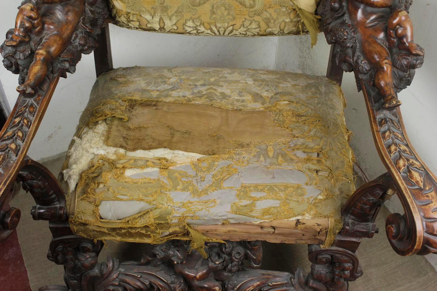 Перед реставратором по тканям Светланой Омелиной стояла не менее сложная задача реставрации обивочной ткани, которая была в ужасном состоянии. Кто-то может спросить: «Почему бы не купить для обивки новую красивую ткань?». Однако принципы современной реставрации заключаются в сохранении подлинности старой вещи, которой нужно восстановить, по возможности, экспозиционный вид. Например, реставратор живописи не может «переписывать» старую картину, а реставратор графики удалять старинные надписи и печати для того, чтобы гравюра или рисунок были «как новенькие». Этот вопрос реставрационной этики. Вот почему Светлана потратила несколько лет на то, чтобы не только собрать по кусочкам редкую старинную ткань — так называемый «рытый бархат», но и вернуть ей былую красоту.