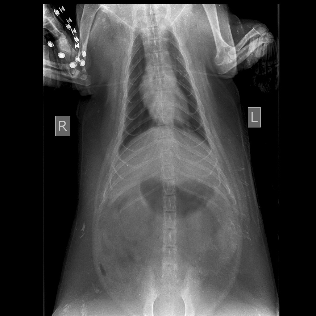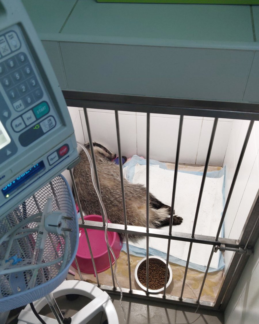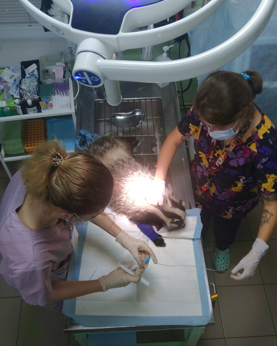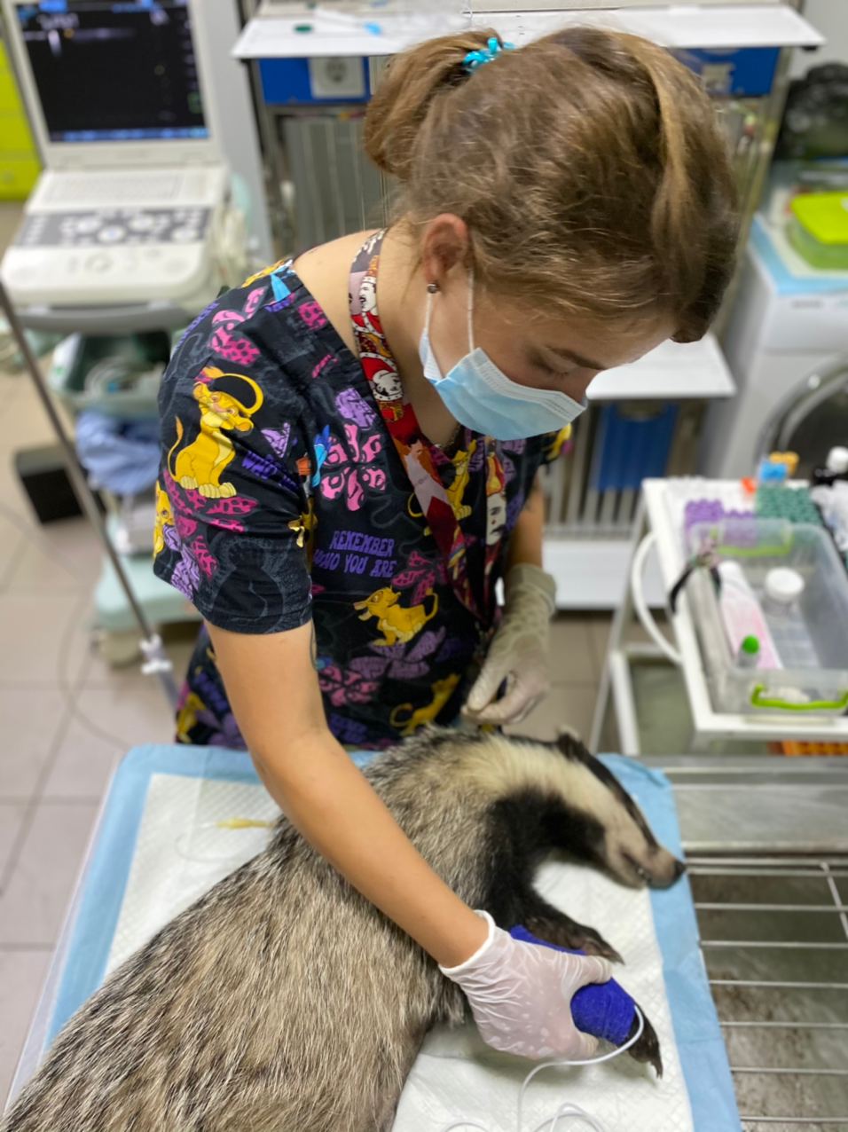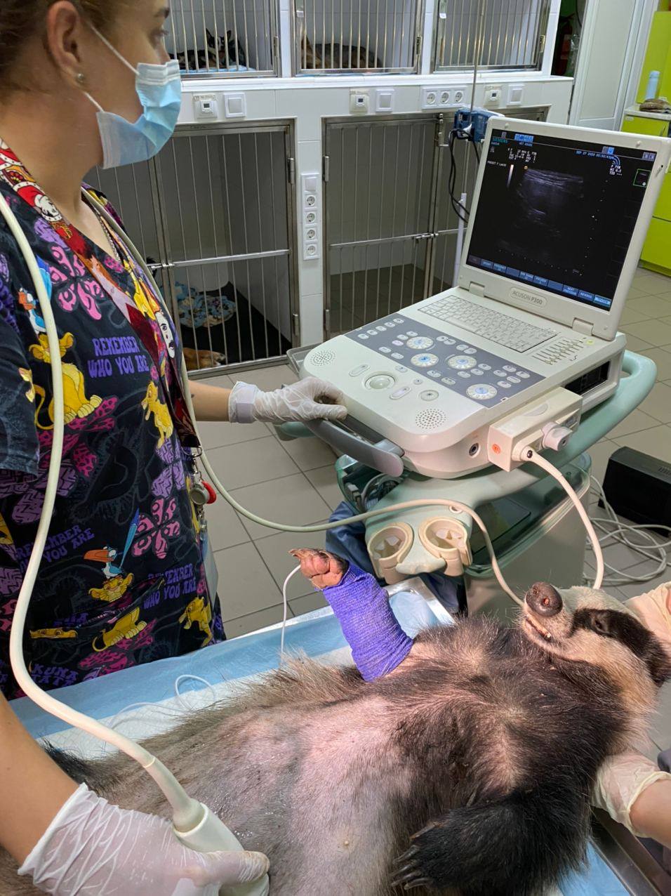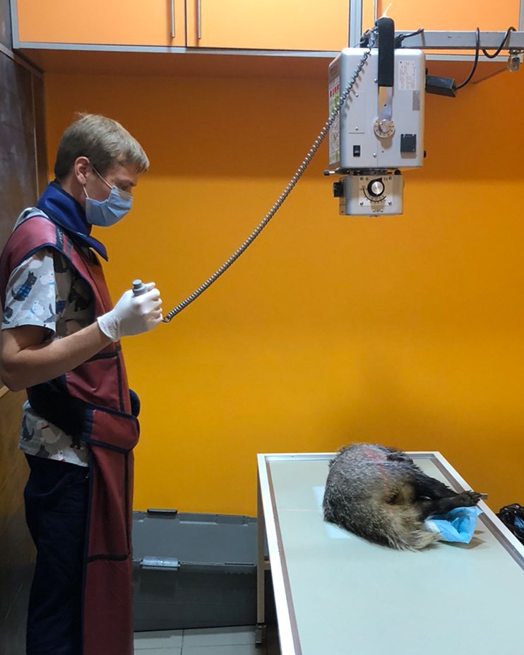 Как рассказали в клинике, барсуку обезболили, сделали УЗИ брюшной полости, обработали от блох и клещей, провели рентгенобследование позвоночника, сделали анализы крови, в том числе на бабезиоз и дали заключение — у барсука обезвоживание, анемия и поражение грудо-поясничного отдела позвоночника неясного генеза, поскольку явных переломов позвоночника по снимкам не выявлено. Причины, по которым зверек пока не пользуется задними лапами, или дифференциальных диагнозов два: