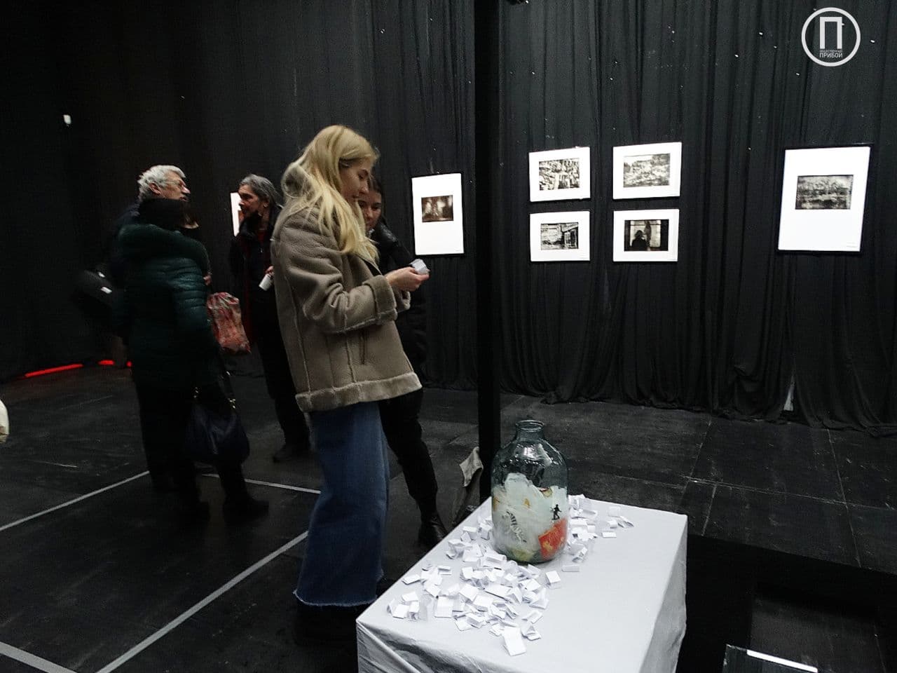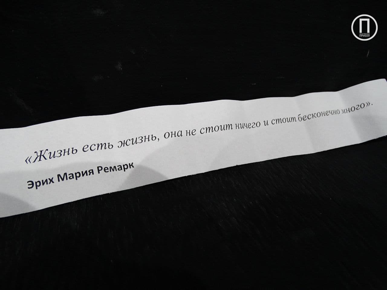 В центре зала также располагается большой сосуд, который наполнен цитатами любимых авторов Виктории — Бродский, Брэдбери, Ремарк, Пратчетт и другие. Каждый посетитель может взять сверток и получить для себя послание. Выбранную цитату автор арт-проекта предлагает расценивать как знак, адресованный лично него.