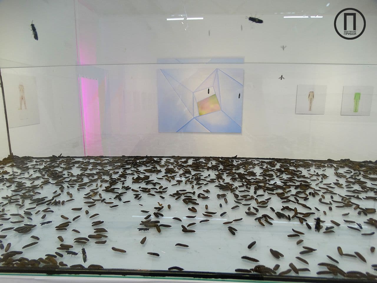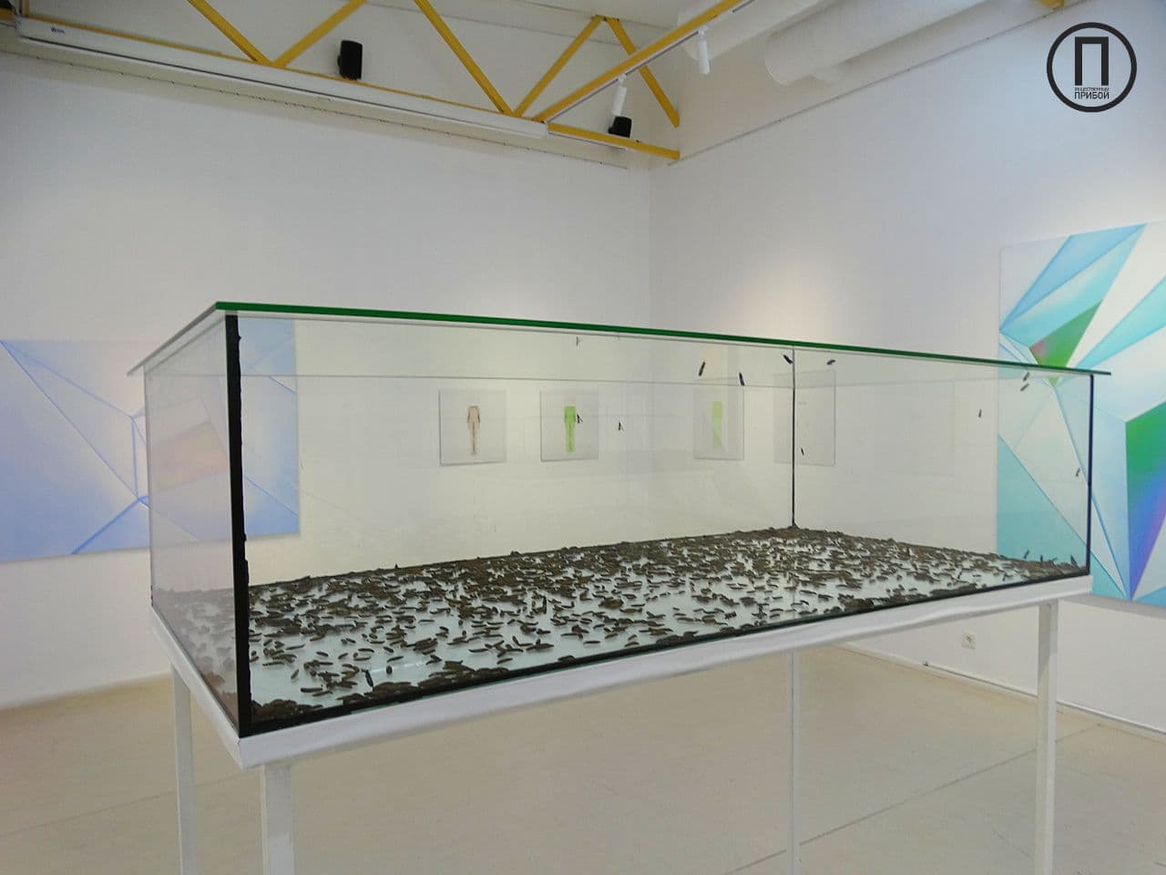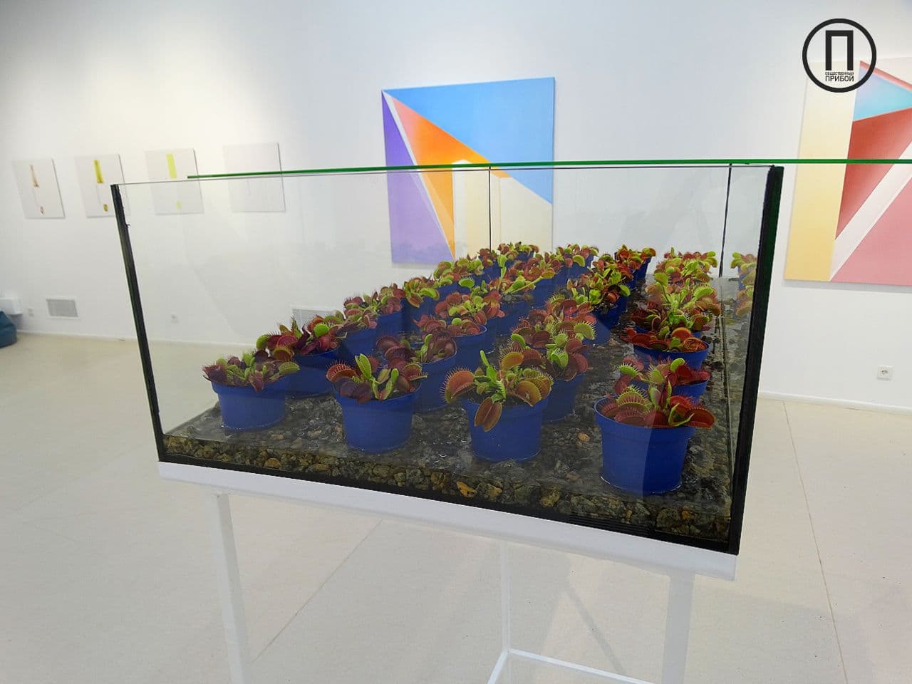 Сочетание фотографии, живописи и инсталляций в пространстве одной экспозиции дополняют друг друга и формируют целостность истории. Первое, что сразу привлекает взгляд, это два аквариума, стоящих в центре зала. В одном – насекомоядные растения, в другом – мухи.
