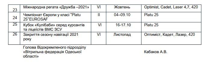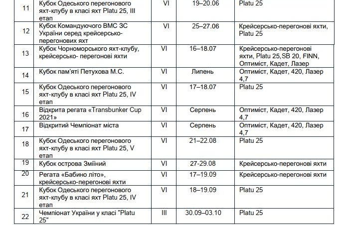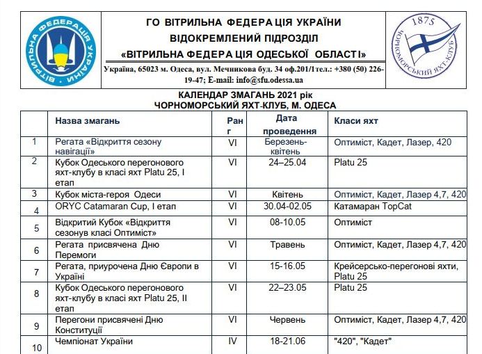 Первым вопросом на собрании было согласование календаря парусных регат на 2021 год, планируемых провести в Черноморском яхт-клубе. Это более 28 регат в разных классах яхт, среди взрослых и детей. Среди них такие регаты, как Кубок Командующего ВМС Украины, Кубок Черноморского яхт-клуба, Чемпионат Украины в классах «Кадет», «420» и «Platu 25», регата «Дружба 2021» среди детей, и впервые за годы независимой Украины Чемпионат Европы в классе «Platu 25».