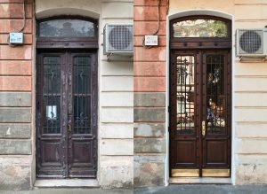 Мастера восстановили и укрепили дверь в целом, воссоздали утраченные декоративные элементы и обе створочные планки. Двери покрыли лазурью от ультрафиолета, маслом от влаги и микроорганизмов, а также натерли полиролем с воском для предоставления объема и дополнительной защиты.