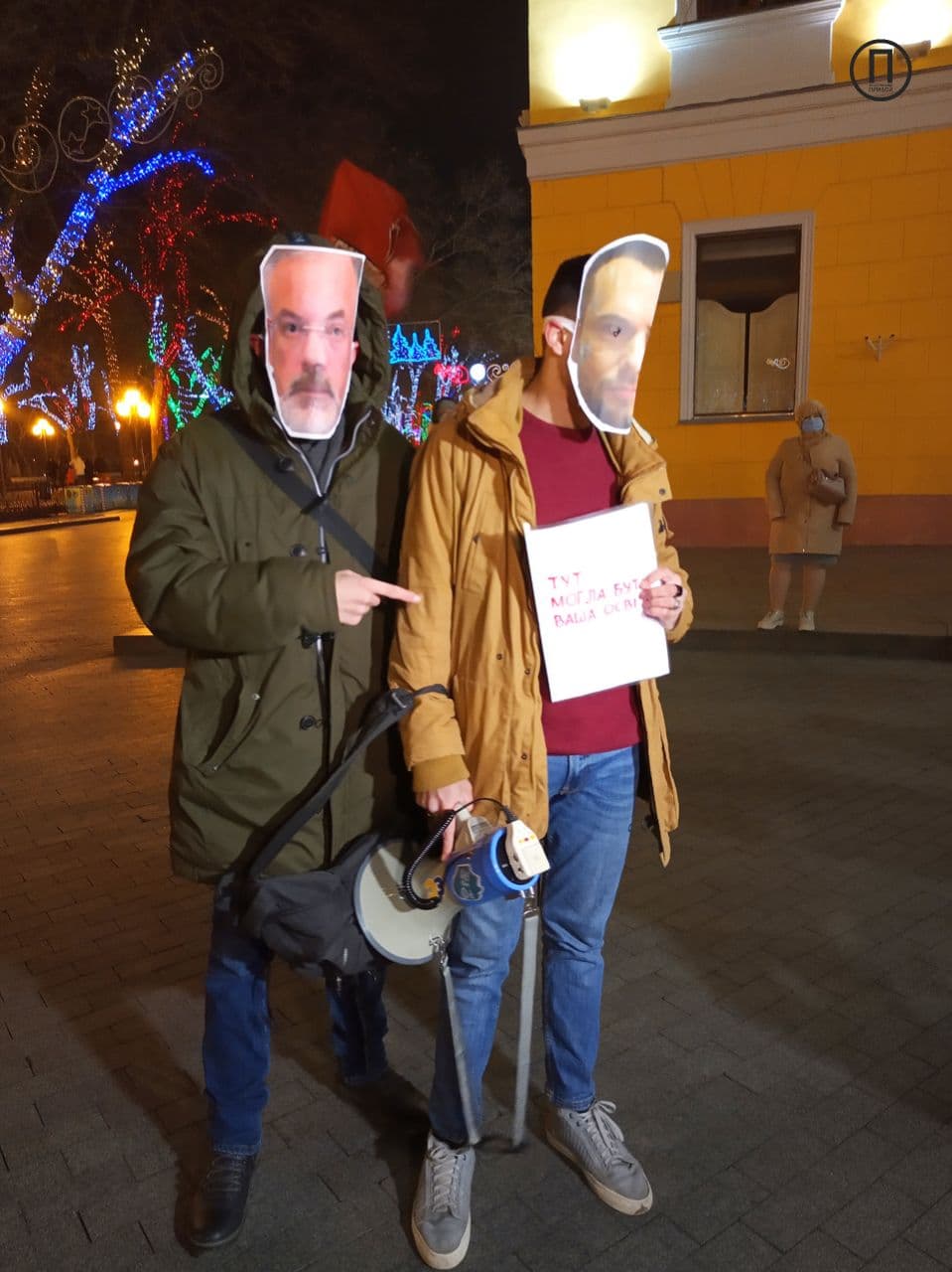 Во время акции протеста участники провели небольшой перфоманс – двое молодых людей в масках с лицами Сергея Шкарлета и Дмитрий Табачникова привели девушку, символизирующую «подавленное образование».