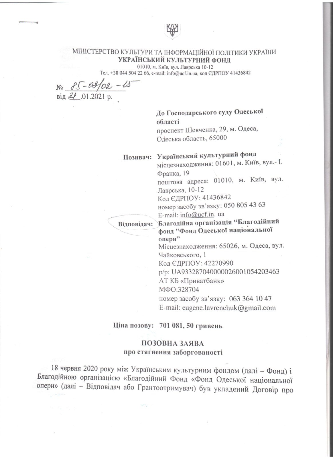Также сообщается, что Лавренчук создал Благотворительный фонд Одесской национальной оперы, от имени которого подал заявку и получил от Украинского Культурного Фонда гранты в сумме более 700 000,0 грн. для реализации проекта «Украинский инклюзивный хор и оркестр», который также не осуществил. А Украинский Культурный Фонд обратился в Хозяйственный суд Одесской области с иском о возврате средств в связи с непредоставлением Лавренчуком надлежащего обоснования расходования полученных средств.