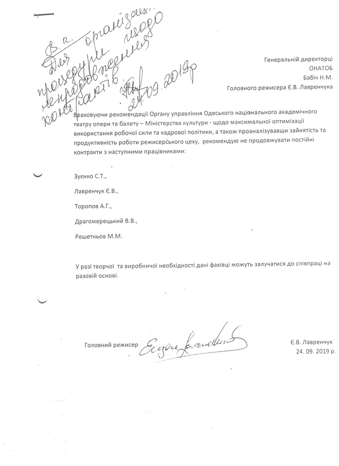 За три года пребывания в должности главного режиссера, Лавренчук поставил только один спектакль «La Traviata» и тот не закончил должным образом: Нет режиссерской концепции, в результате чего каждый показ происходил с изменениями, что приводило к нервотрепке и травмированию исполнителей. К этому времени Лавренчуком не разработан паспорт представления, что влечет за собой проблемы во время монтажа декораций и неоправданному увеличению времени перерывов между актами спектакля, что вызывало недовольство зрителей, которые оставляли театральный зал до завершения представления«, — говорится в сообщении.