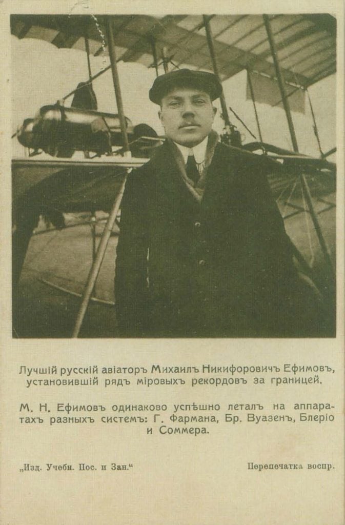Михаил Ефимов родился на Смоленщине, но в поисках работы его отец с семьей в 1891 г. переехал в Одессу. Михаил окончил железнодорожное училище, но в итоге связал свой жизненный путь с вело и мотоспортом и, конечно же, с небом. Он стал первым в Российской империи дипломированным летчиком (вторым стал Сергей Уточкин), блестяще сдав экзамены в авиашколе Анри Фармана во Франции. Обучение ему оплатил банкир Ксидиас. Диплом числится под номером 31, от 15 февраля 1910 г. Газета «Одесские новости» с изображением этого документа размещена в экспозиции Одесского историко-краеведческого музея.