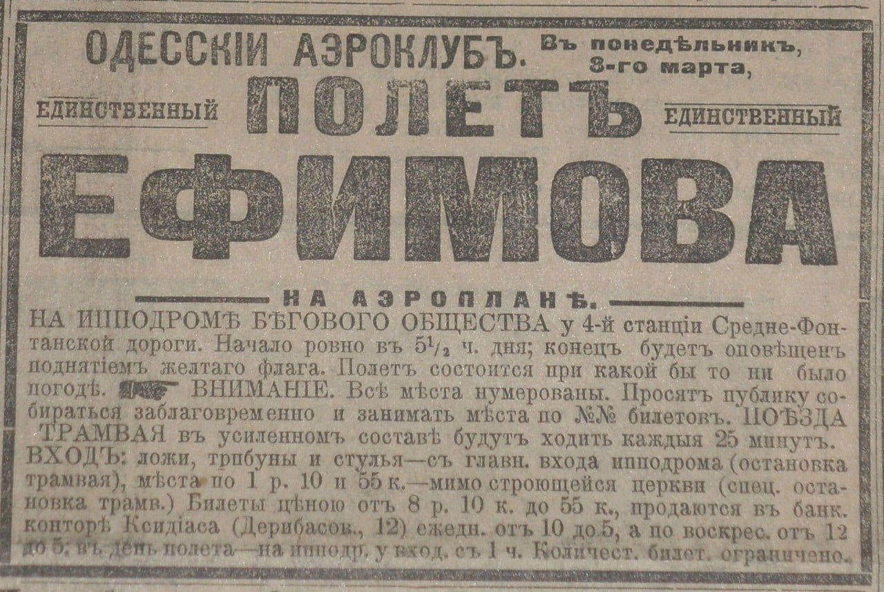 21 марта 1910 г. Михаил Никифорович Ефимов совершил в Одессе первые в Российской империи публичные полеты на Одесском ипподроме, на самолете «Фарман-4». В тот же день он поднимался в небо с Ксидиасом и Артуром Анатрой. На следующий день в Одессу пришла телеграмма, что Ефимов избран почетным членом Киевского общества воздухоплавания. Уже в апреле Михаил Ефимов выиграл престижные соревнования авиаторов в Ницце, заработал 77 000 франков и оплатил обучение у Фармана, а затем приобрел собственный аэроплан.