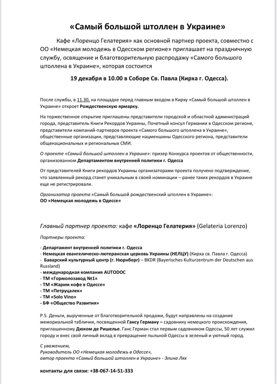 Возле одесской Кирхи на Новосельского устроят Рождественскую ярмарку. Она откроет свои двери 19 декабря в 11:30 и будет работать до 27-го декабря. В день открытия здесь презентуют «самый большой штоллен Украины». Штоллен – это традиционный немецкий рождественский кекс. Организация «Немецкая молодежь в Одесской области» намерена поставить рекорд Украины, и с помощью одесских пекарен сделать самый большой штолллен.