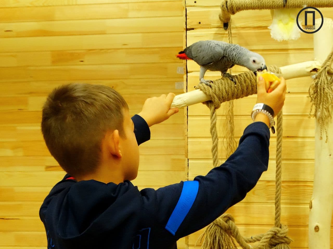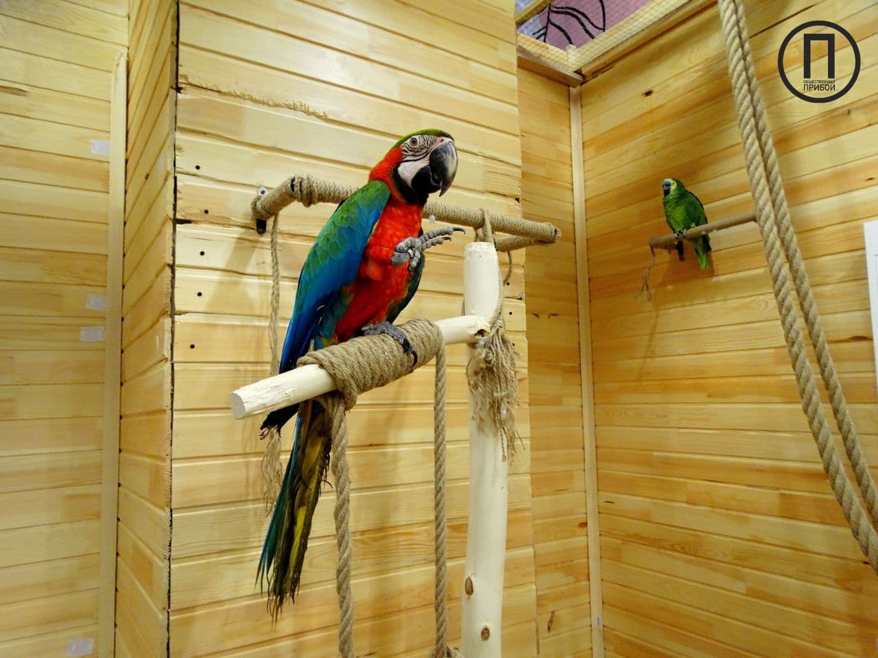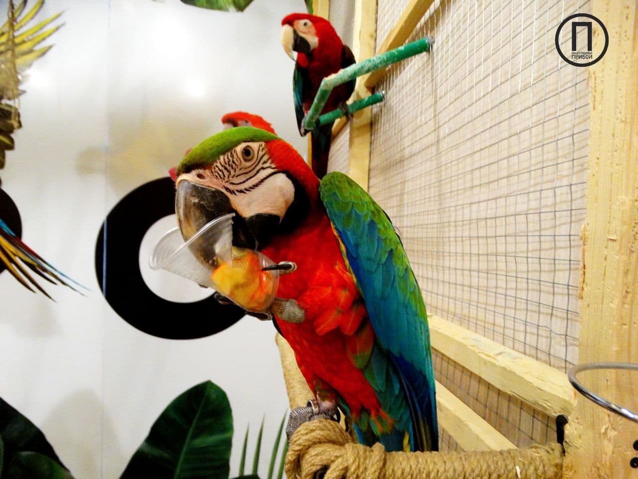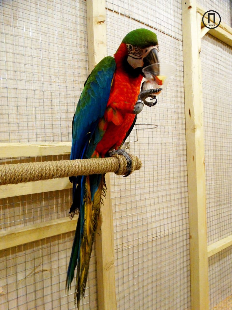 Звезда попугайни – Красный Ара, по кличке Арчи. Вес птицы аж 1,5 килограмм,а поэтому подержать его на вытянутой руке будет не просто, но он с радостью примет у вас угощение, а скорее всего и весь стаканчик с лакомством.