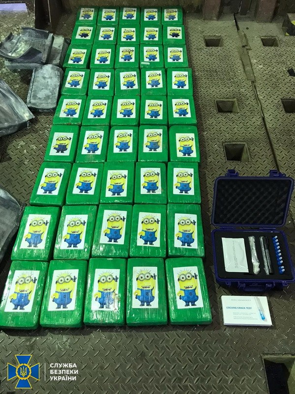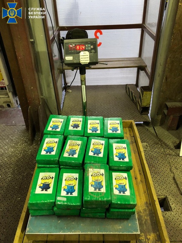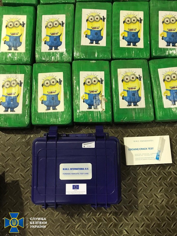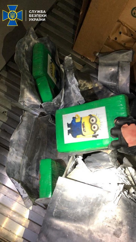 При осмотре в порту грузового контейнера с бананами, сотрудники СБУ обнаружили первую партию наркотика. 45 брикетов с высококачественным кокаином были спрятаны среди легального груза. Для подтверждения качества «товара» отправители маркировали пакеты своим «фирменным знаком» — изображением «миньона», что указывает на принадлежность к одному из южноамериканских наркосиндикатов. Для усложнения обнаружения наркотика сканером, каждый брикет был обернут в свинцовую упаковку.