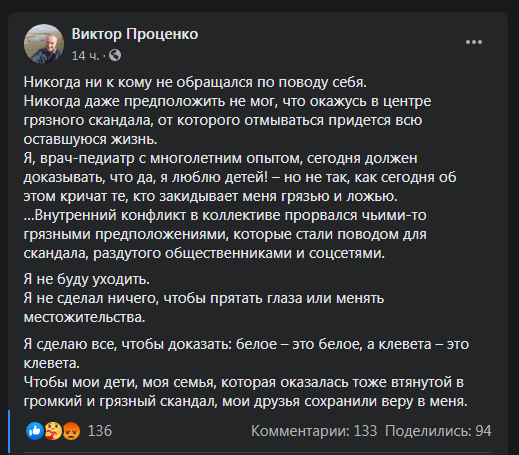 Отметим, что по словам медсестры Елены Бирки, у детей нет нарушений в развитии, как заявлено в сообщении полиции. Директор Дома малютки Виктор Проценко все обвинения в свой адрес называет клеветой. Он дал свой комментарий на странице в Facebook.
