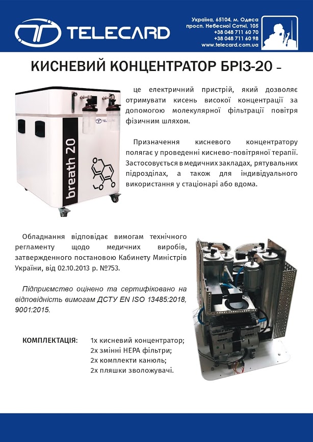 В Одессе завод «Телекарт-Прибор» начинает производство медицинских концентраторов для всей страны. На данный момент украинская модель проходит последние стадии апробации, а в конце декабря концентраторы планируют поставить на украинский рынок. Модель получила название «Бриз-20»
