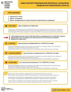 «В каждом регионе определены больницы для пациентов с COVID-19. Если в этих медучреждениях в течение 5 дней подряд занятость коек превышает 50%, это рассматривается как переход на другой уровень опасности. Что касается второго пункта — среднее количество тестирований методами ПЦР и ИФА должна составлять не менее 24 на 100 000 населения в течение последних 7 дней. Этот показатель определяется на уровне области. По последнему пункту, то базовый уровень заболеваемости COVID-19 сейчас — 40 случаев на 100 000 населения за 14 дней. Город или район, где этот показатель превышен, переводится на новый уровень эпидемической опасности », — сообщил Максим Степанов.