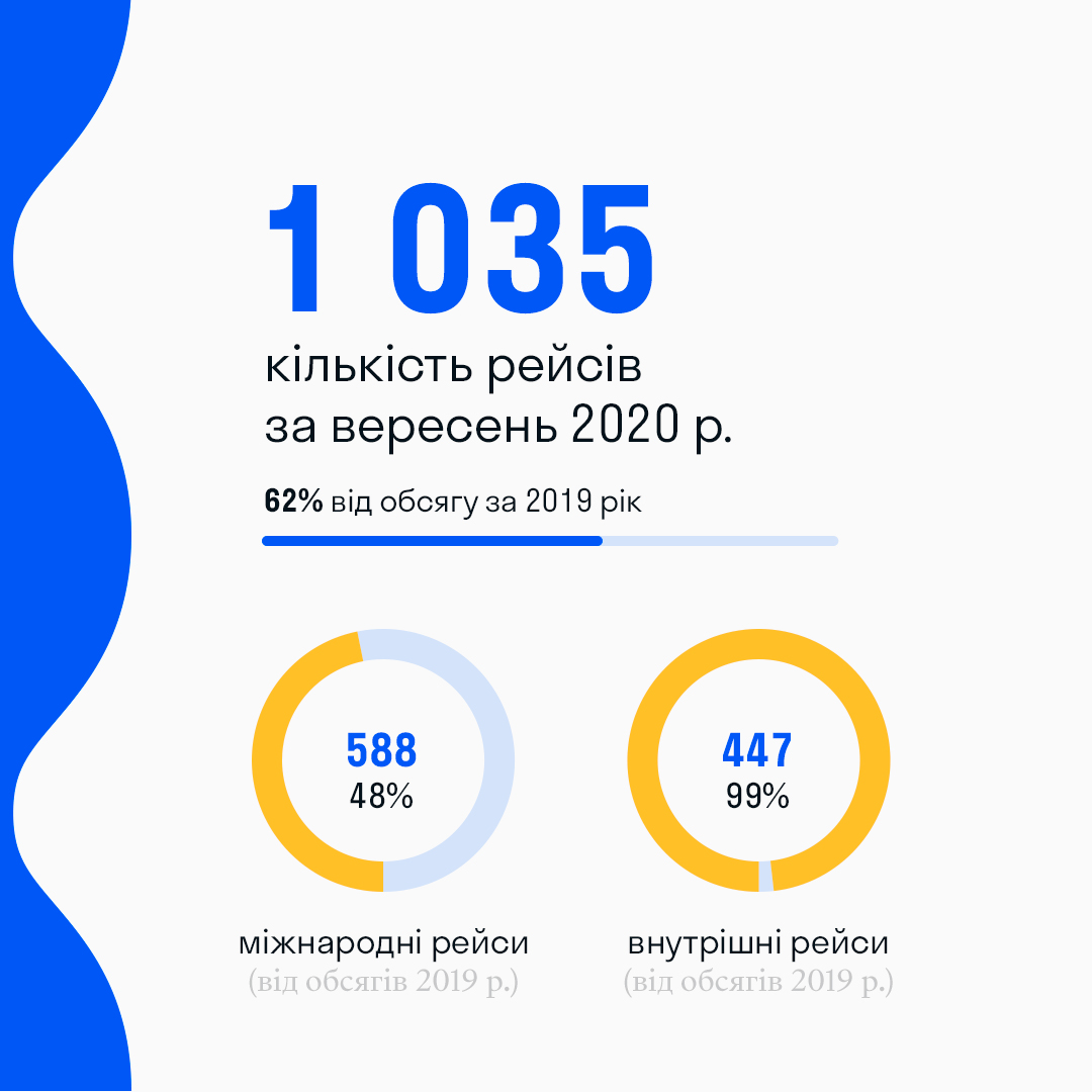 В сентябре текущего года выполнено 1035 рейсов, что на 38% меньше, чем в сентябре 2019 года (международные рейсы — 588 (-52%), внутренние рейсы — 447 (-1%).