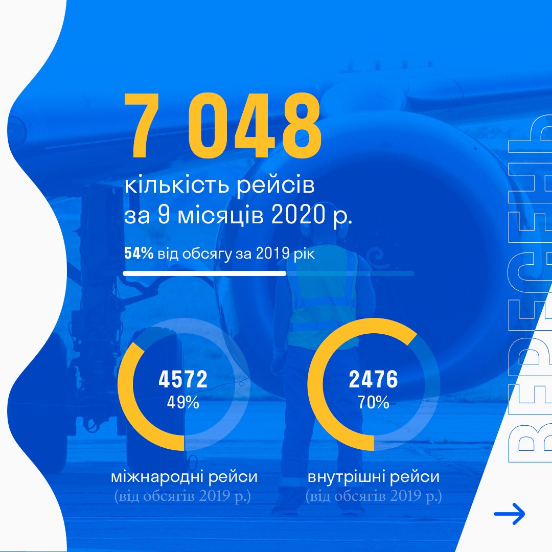 Количество выполненных рейсов за девять месяцев 2020 года составило 7048, что на 46% меньше, чем за аналогичный период 2019 года (международные рейсы — 4572 (-51%), внутренние рейсы — 2476 (-30%).