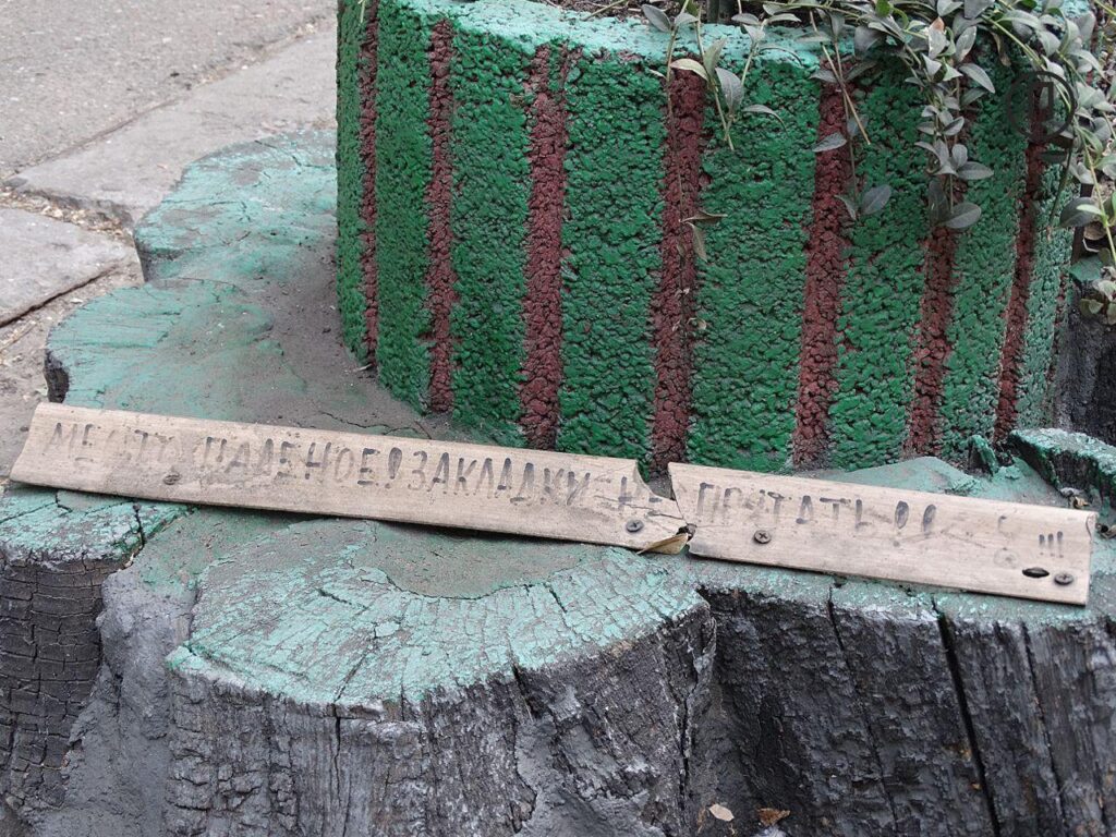 Как рассказала Марина, для «закладок» выбирают места: под лестницей внутри двора, под козырьком подоконника, в ливневой трубе, за воротами и возле пеньков снаружи двора. Жители дома напротив даже предусмотрительно поставили на пенек табличку с надписью «Место паленое! Закладки не прятать».