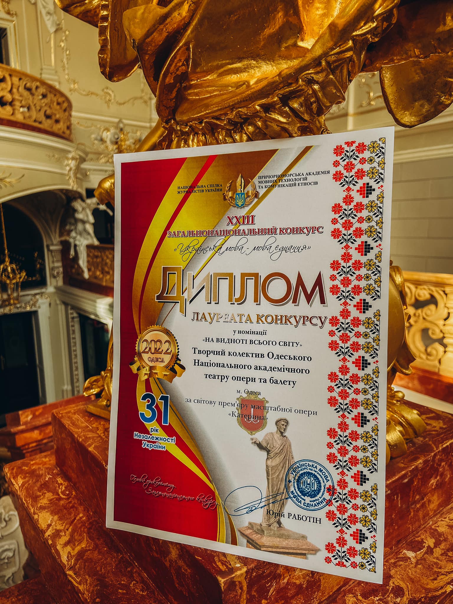 Одеський національний академічний театр опери та балету став лауреатом ХХІІІ Загальнонаціонального конкурсу «Українська мова – мова єднання» та отримав почесну відзнаку. Про це повідомляється на сторінці Одеської опери у Facebook.