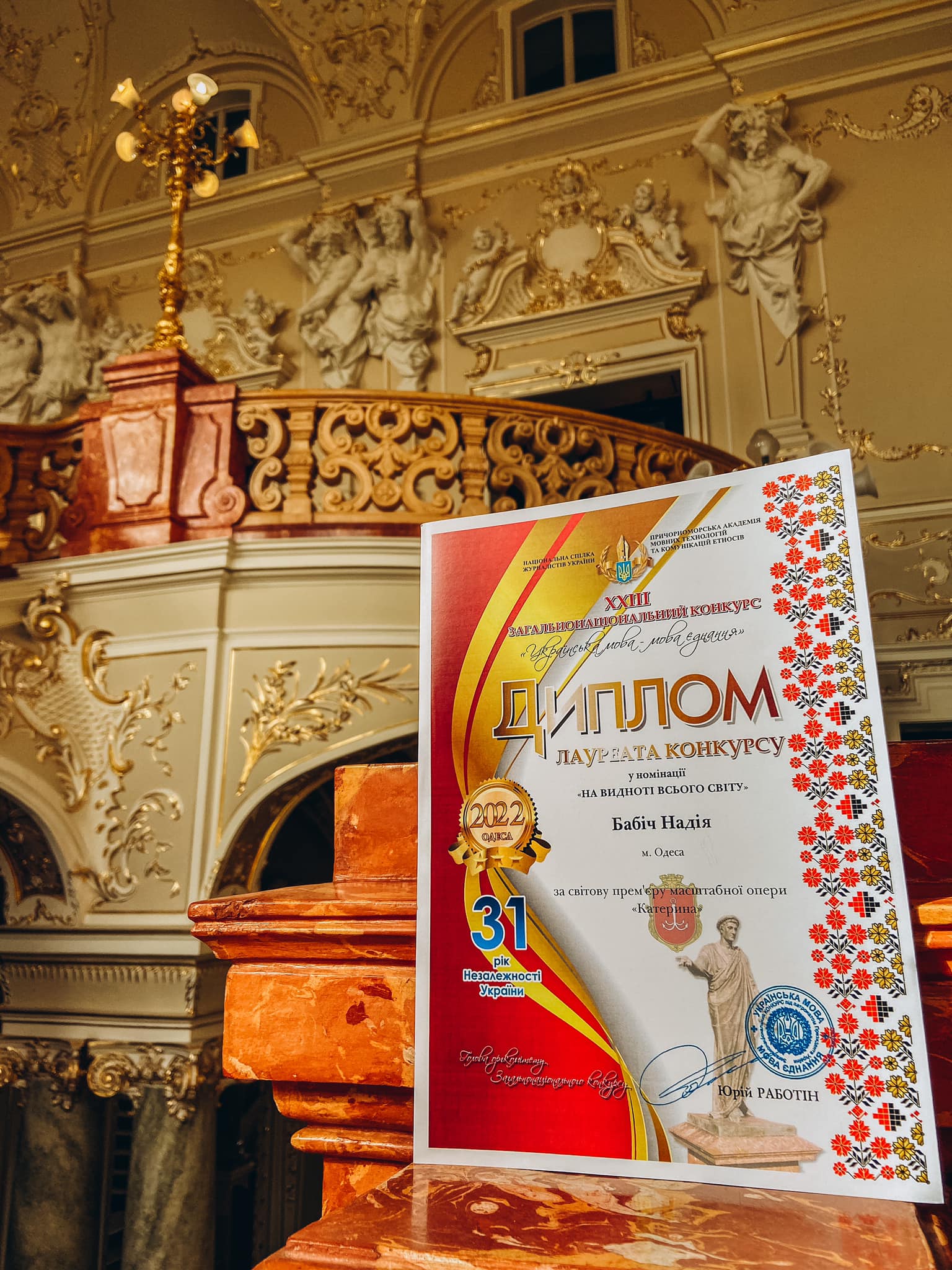 Крім того, творчий колектив театру та генеральний директор – художній керівник Надія Бабич відзначені спеціальними дипломами конкурсу у номінації «На очах світу» за світову прем’єру опери «Катерина».
