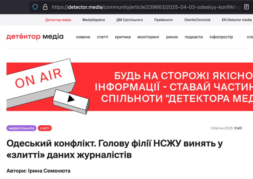 Кульмінацією «розбірок» у НСЖУ стала стаття на «Детектор Медіа» під назвою «Одеський конфлікт. Голову філії НСЖУ винять у «злитті» даних журналістів».