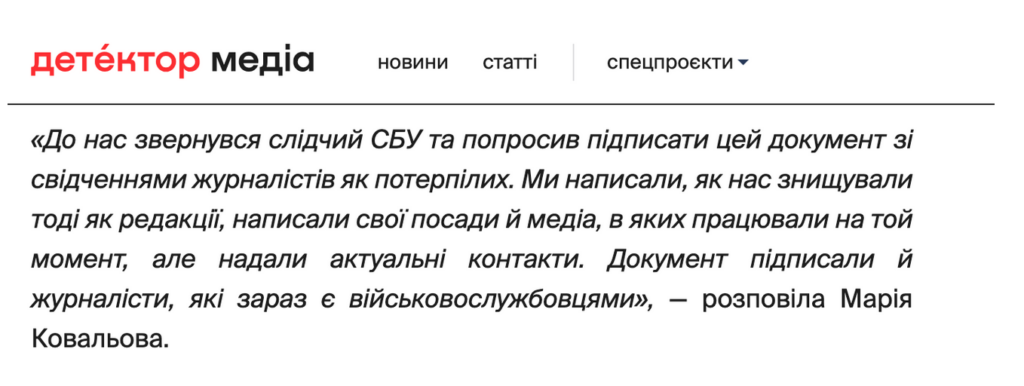 Цитата №2, яка належить Марії Ковальовій: «До нас звернувся слідчий СБУ і попросив підписати цей документ із показаннями журналістів як потерпілих. Ми підписали, як нас знищували, тоді як редакції написали свої посади у медіа, де працювали на той момент, але дали свої актуальні дані. Документ підписали і журналісти, які зараз є військовослужбовцями».