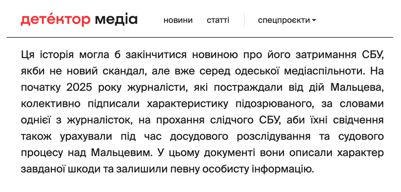 Цитата №1: «На початку 2025 року журналісти, які постраждали від дій Олега Мальцева, колективно підписали характеристику підозрюваного, за словами однієї з журналісток, на прохання слідчого СБУ, щоб їхні показання також були враховані під час досудового розслідування та судового процесу над Мальцевим. У цьому документі вони описали характер завданої шкоди та залишили певну особисту інформацію».